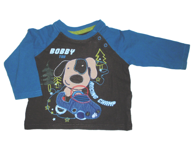 Chlapecké modro-hnědé tričko s dlouhým rukávem a motivem pejska. Zapínání na cvočky.
