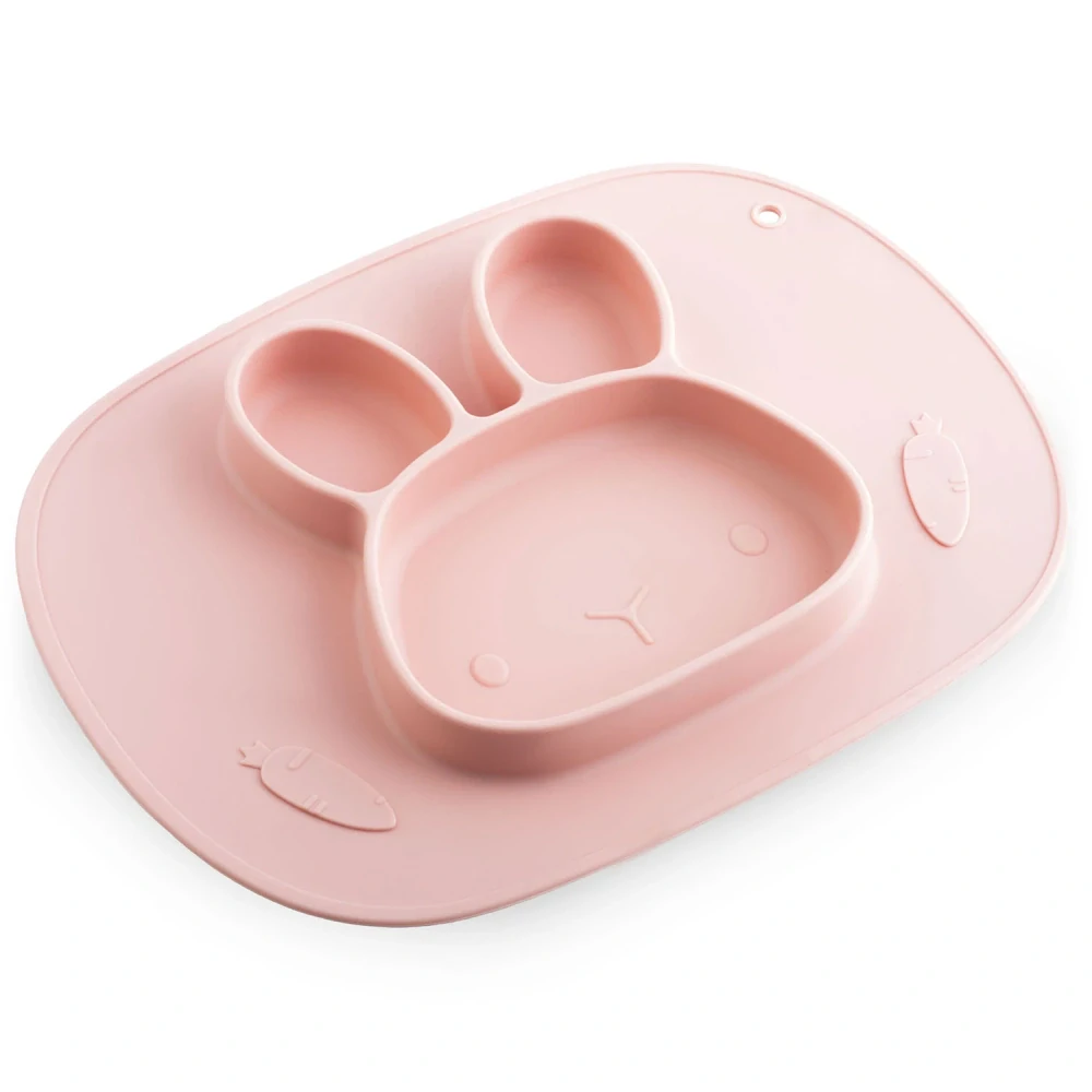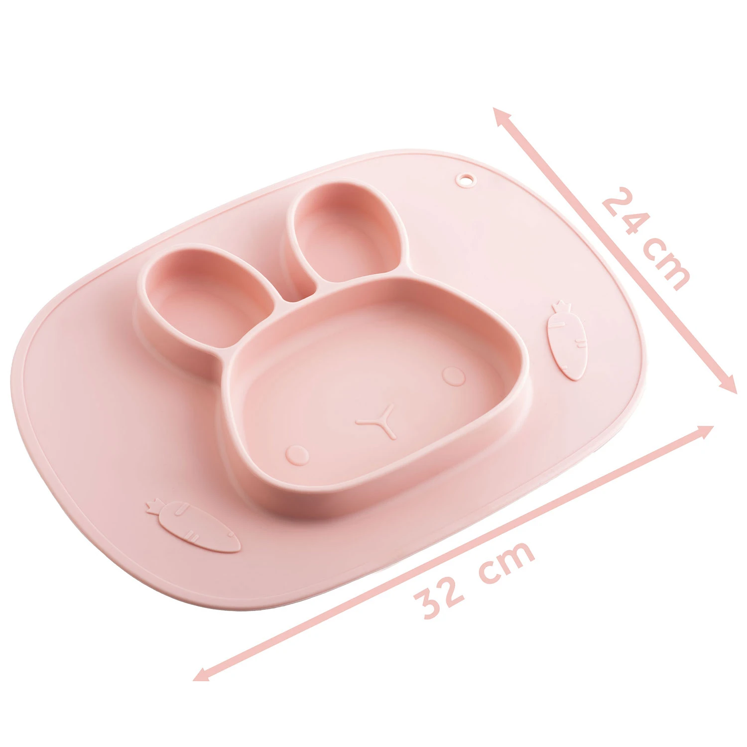 Představujeme silikonový dětský talířek 2v1 ve tvaru roztomilého králíčka. Tento multifunkční talířek slouží nejen jako talířek na jídlo, ale zároveň i jako prostírání, které chrání stůl před znečištěním. Usnadní tak přechod na samostatné stolování a navíc se postará o pořádek během jídla.