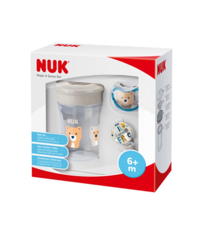 NUK Magic Cup z nové řady, dudlík NUK Space a NUK stužka na dudlík dohromady perfektně ladí v atraktivním setu. Každý set obsahuje: