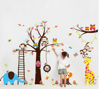 Tato roztomilá dětská samolepka na zeď Strom s opičkami, slonem, žirafou a dalšími zvířátky všude kolem rozveselí stěny pokojíčka vašich nejmilejších.
