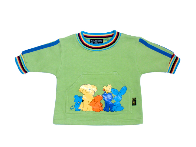 Zelená mikina s velkou kapsou, na níž je motiv zvířátek. Na konci rukávů je zúžení, aby dětem do rukávů nenafoukalo.