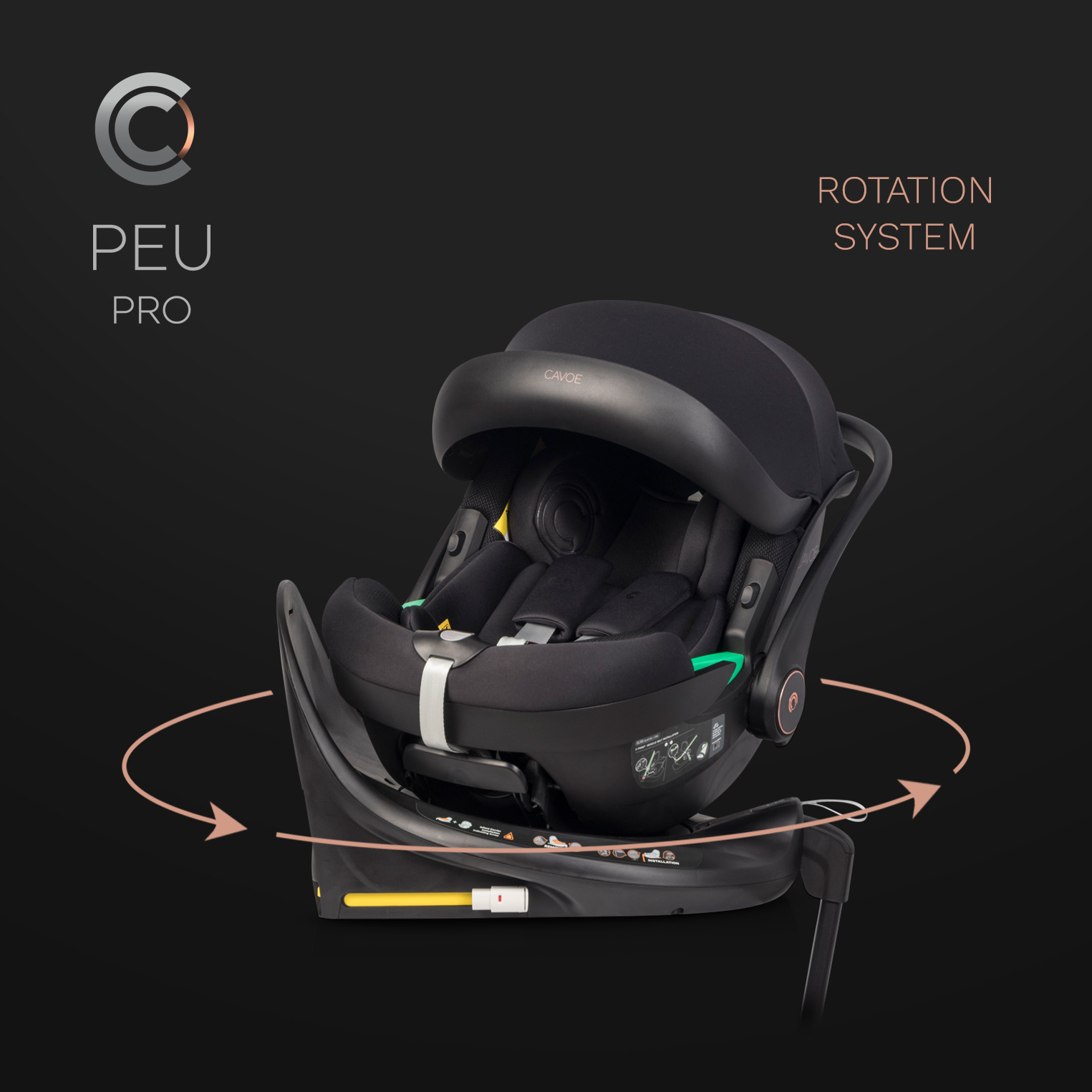 MODERNÍ MÓDNÍ STYL - elegantní černá v kombinaci s estetickými měděnými povrchy dělají z autosedačky PEU nejen bezpečný, ale i krásný výrobek. Skvěle se hodí ke stylu kočárků CAVOE a zároveň ladí s jakýmkoliv čalouněním auta.