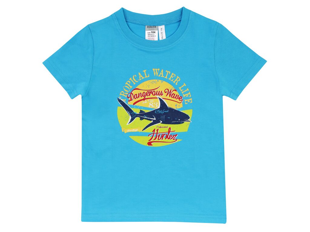 Modré tričko s krátkým rukávem a obrázkem žraloka.