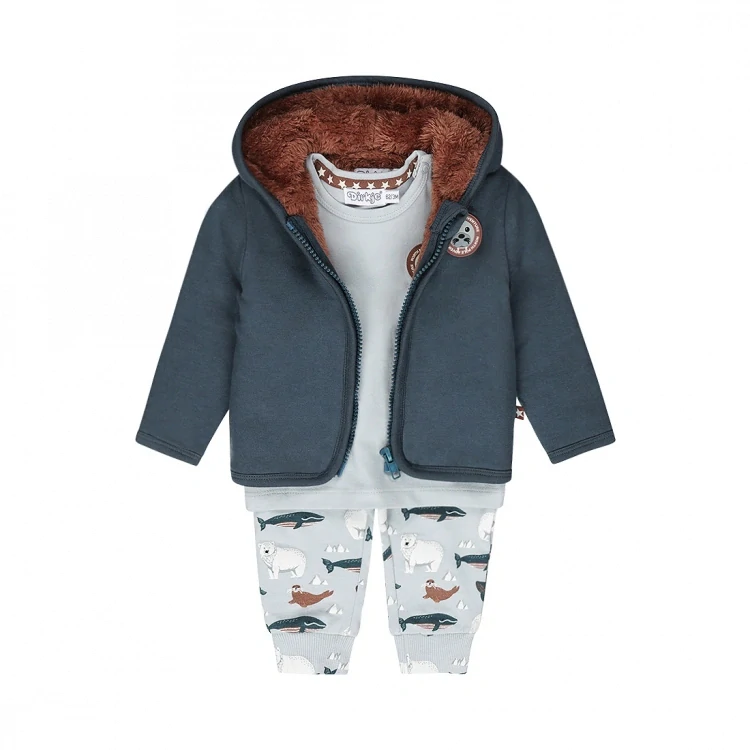 Chlapecký 3-dílný komplet triko+kalhoty+zimní bundička podšitá hnědým kožíškem.