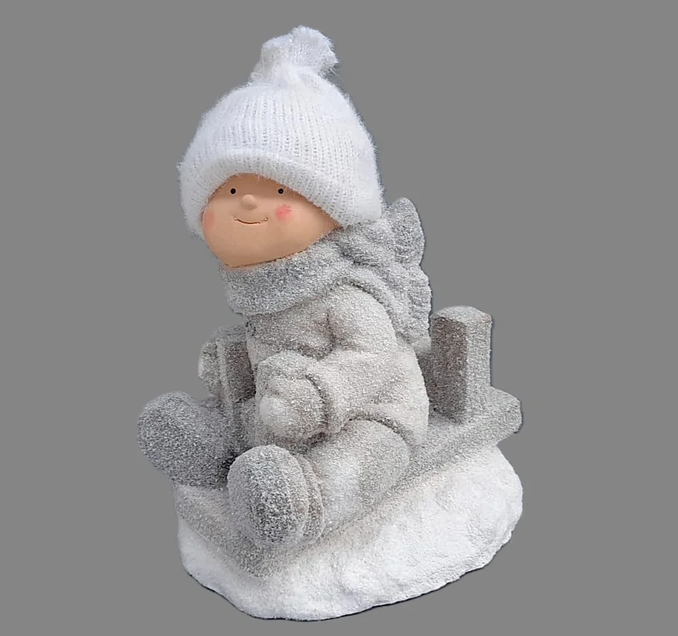 Rozkošná Dekorační Figurka – Kluk v Čepici na Sáňkách