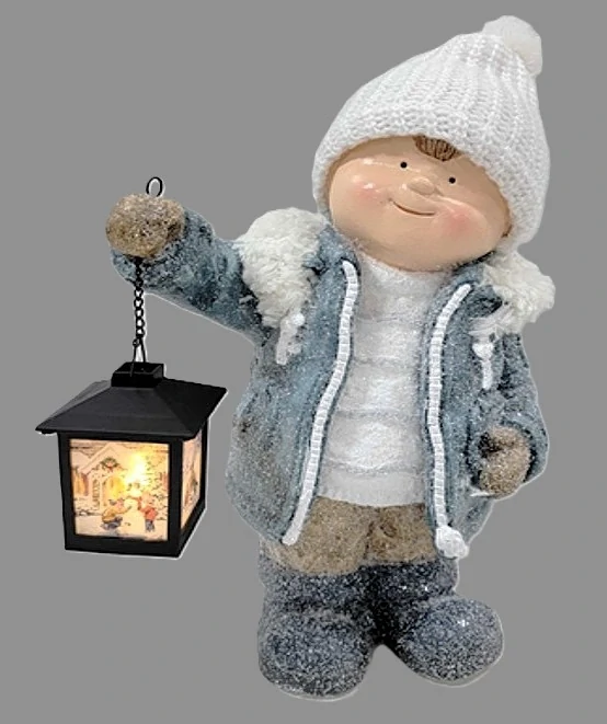 Dekorační figurka - Kluk v čepici s LED lucernou