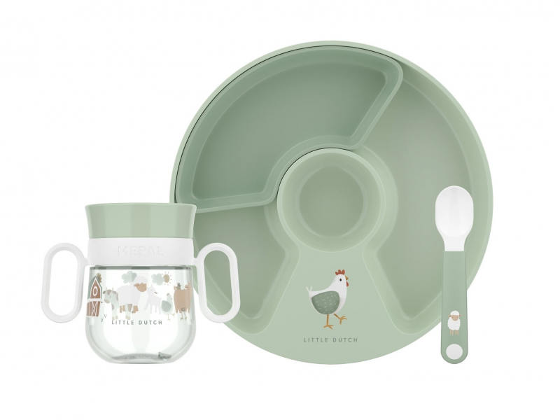 3-dílná jídelní sada v krásném designu s jemným potiskem obsahuje dětský dělený talíř, trénovací hrnek se systémem 360° a lžičku.