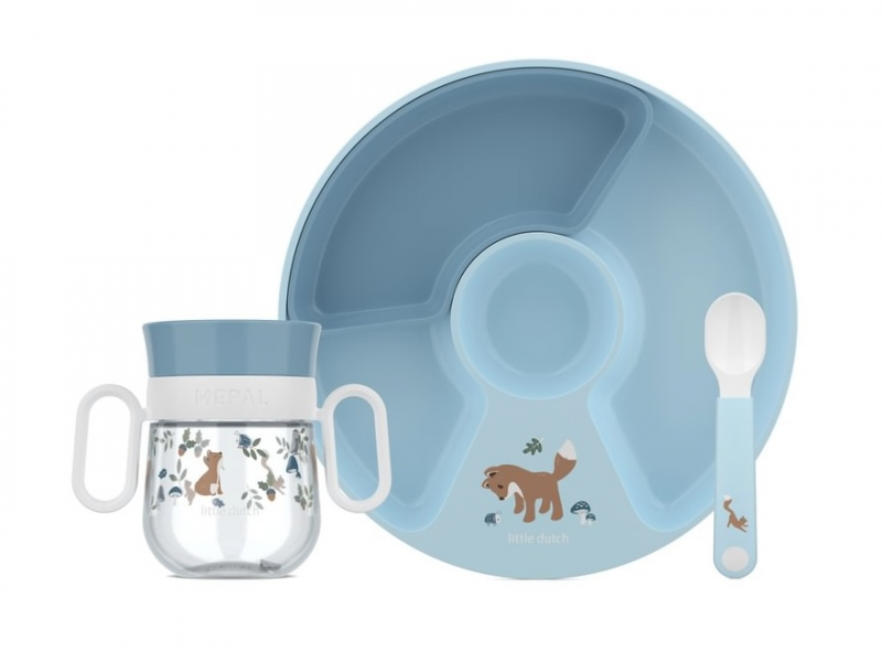 3-dílná jídelní sada v krásném designu s jemným potiskem obsahuje dětský dělený talíř, trénovací hrnek se systémem 360° a lžičku.