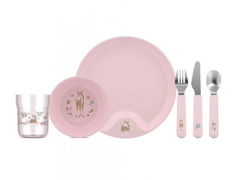 6-dílná jídelní sada v krásném designu s jemným potiskem obsahuje dětský talíř, misku, kelímek, lžíci, vidličku a nůž.