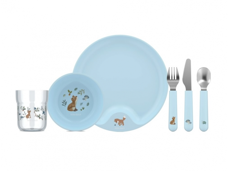 6-dílná jídelní sada v krásném designu s jemným potiskem obsahuje dětský talíř, misku, kelímek, lžíci, vidličku a nůž.