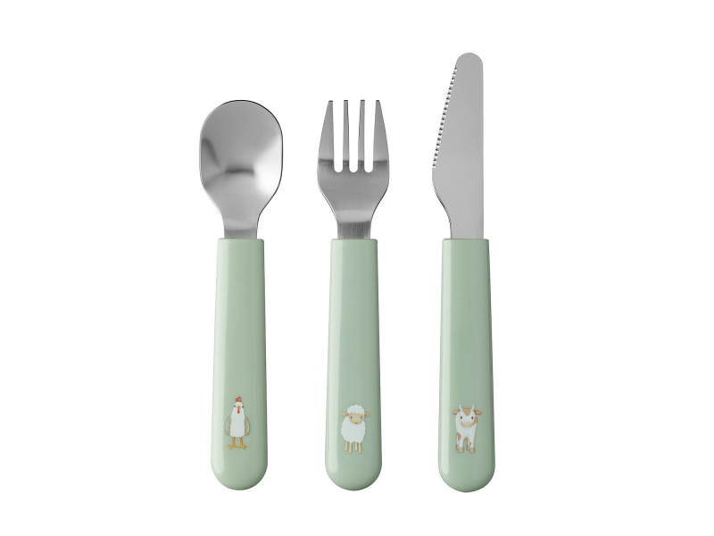 3-dílná sada příboru z kvalitní nerezové oceli s plastovou rukojetí pro snadné držení s krásným potiskem. Nůž má bezpečný zoubkovaný okraj.