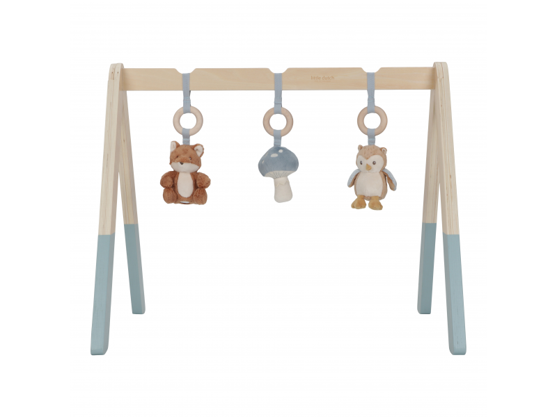 Stylová dřevěná hrazdička se třemi zavěšenými plyšovými hračkami v podobě lišky, sovy a houbičky poskytne vašemu miminku spoustu zábavy při hraní na dece. Jednotlivé hračky lákají dítě ke zkoumání a dotýkání, při pohybu chrastí a šustí. Odnímatelné hračky je možné používat i samostatně.