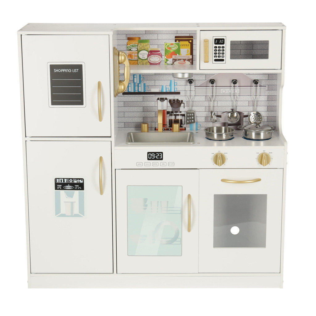 Dřevěná kuchyňka má ideální velikost - její výška byla přizpůsobena věku dětí, aby byly všechny prvky na odpovídající úrovni. Díky četným pohyblivým prvkům, jako jsou otevírací skříňky a pohyblivé knoflíky, se děti cítí jako ve skutečné kuchyni, ale mnohem bezpečněji.