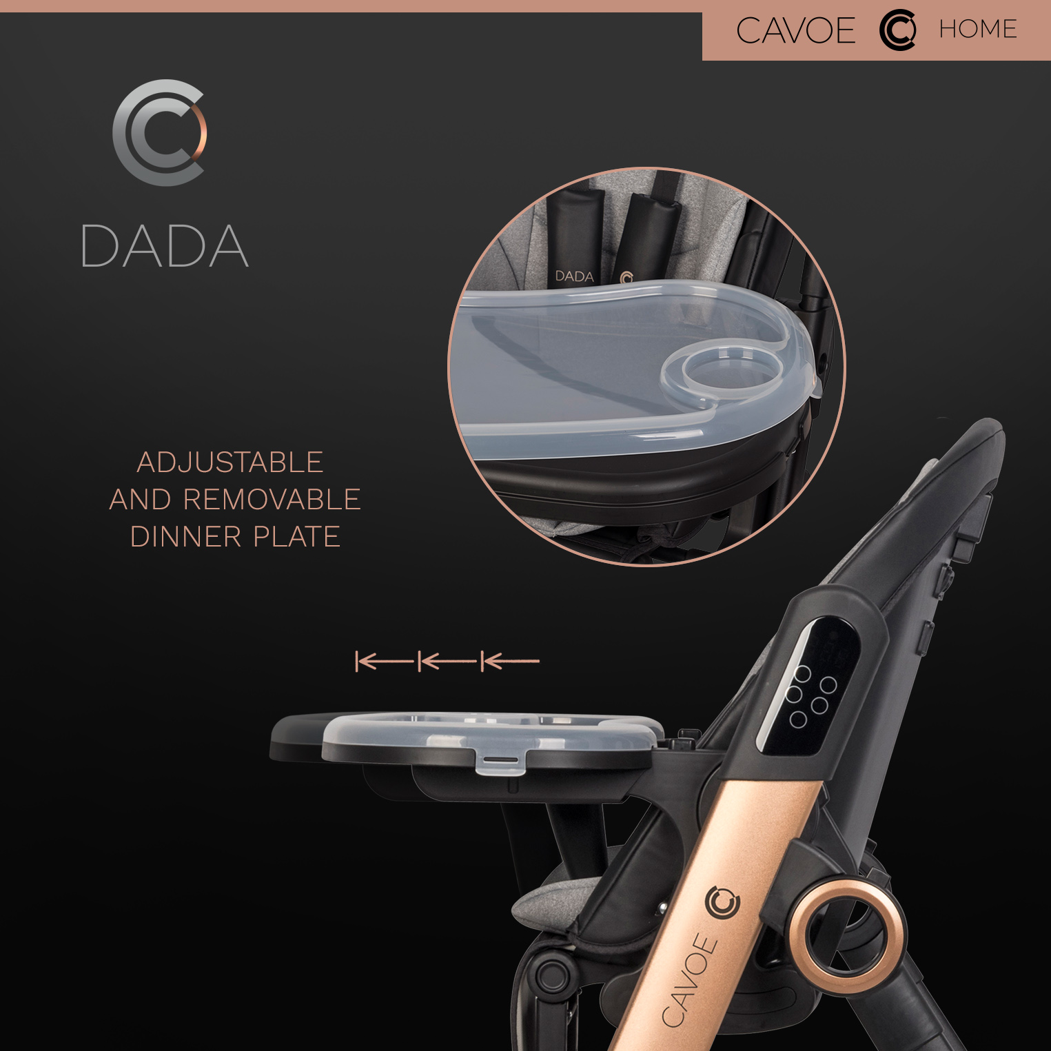 Kromě funkce elektrické houpačky je DADA také velmi pohodlnou a extrémně funkční vysokou židlí. Má všechny možné a uživateli požadované funkce, které by dobrá vysoká židle měla mít.