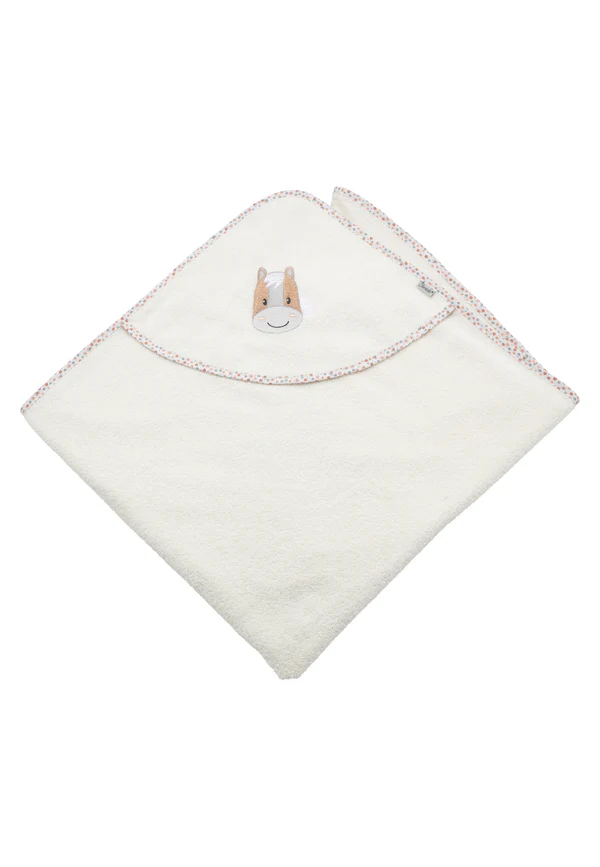 Roztomilý design: Kapuci zdobí detailní výšivka koníka a stylové květinové lemování, které dodává osušce něžný a hravý vzhled.