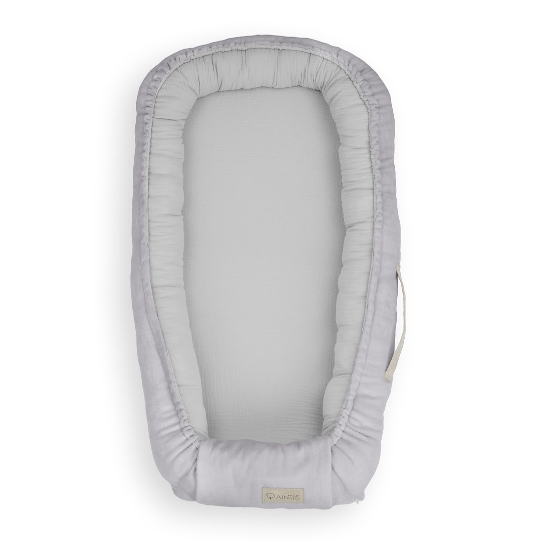 Mušelínové hnízdečko od Albero mio je perfektním místem pro spánek a odpočinek pro novorozence a miminka. Hnízdečko poskytuje miminku pocit bezpečí a pohodlí, napodobuje podmínky v matčině bříšku. Jemná mušelínová tkanina uvnitř obepne vaše dítě, zatímco měkký velur na vnější straně poskytuje extra pohodlí. Výplň hnízdečka je hypoalergenní, což minimalizuje riziko alergií a podráždění pokožky dítěte.