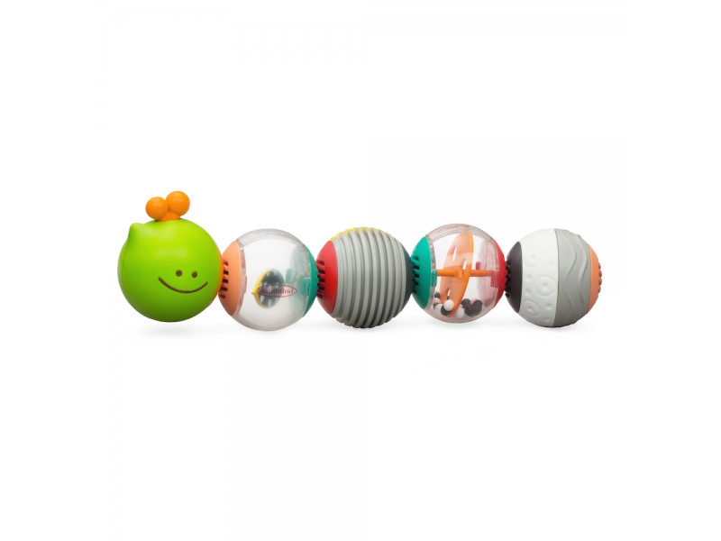 Roztomilá housenka je tvořená pěti míčky, které je možné rozdělit a znovu spojovat. Po rozpojení je možné si hrát i samostatně s jednotlivými míčky. Míčky chrastí a nabízejí různorodé textury ke zkoumání. Tykadla housenky slouží i jako kousátko.
