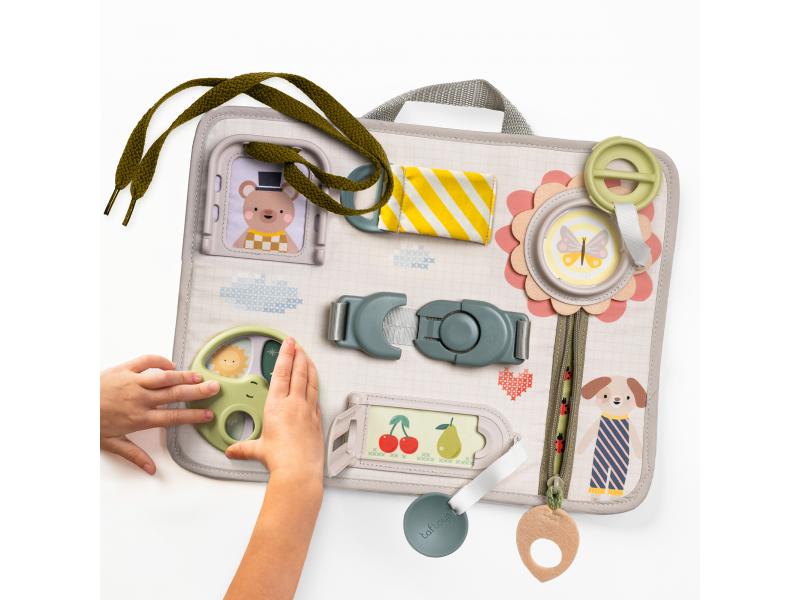 Originální hrací pult nabízí množství různorodých aktivit, mezi kterými najdete zip, velký knoflík, suché zipy tkaničky, přezku, poutko a mnoho dalšího. Zapínáním a rozepínáním si děti procvičují jemnou motoriku i koordinaci oko-ruka. Aktivity zároveň podporují rozvoj kreativity dítěte i jeho schopnosti řešit problémy.