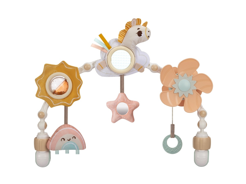 Hrazda Tiny Love Unicorn Wonderlands v jemných pastelových barvách s pohádkovým motivem jednorožce je vhodná na kočárek, autosedačku či lehátko. Nabízí množství aktivit pro zabavení dítěte na cestách i doma, např. chrastítko, kousátko, otáčecí větrník nebo bezpečné zrcátko.