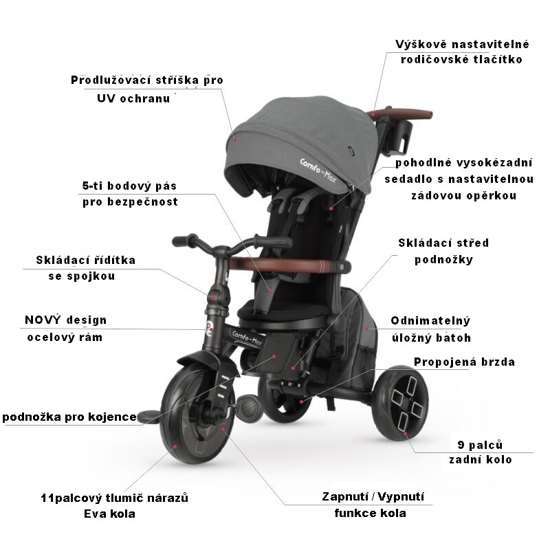 Multifunkční skládací tříkolka 8v1 Qplay Comfo Max greycentrální sklad 1 ks4 290 Kč/ ks3 545 Kč bez DPH