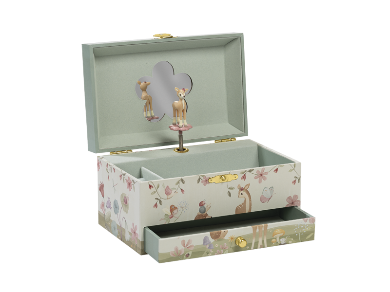 Krásná šperkovnice se zrcátkem a hudebním boxem, který po natažení hraje něžnou melodii. Vaše malá parádnice si do šperkovnice s potiskem motivů ze života v lese může ukládat své šperky a jiné vzácné drobnosti.