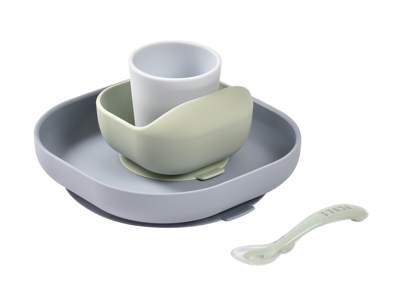 Sada talíře, misky, kelímku na pití a lžičky z vysoce kvalitního silikonu je ideální pro první samostatné krmení. Přísavka u misky a talíře umožňuje uchycení ke stolu nebo pultu jídelní židličky. Ergonomický tvar usnadňuje nabírání příkrmu.