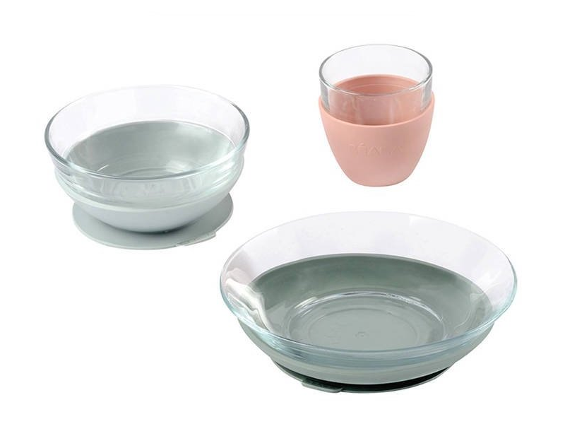 Unikátní sadu nádobí z tvrzeného skla tvoří jídelní miska, talířek a sklenička ergonomického, zaobleného tvaru s hladkými hranami. Miska a talíř jsou doplněny speciálními odnímatelnými podložkami z pružného materiálu s přísavkou, která zajišťuje stabilitu misky či talíře na stole a usnadňuje dítěti stolování. Návlek na skleničku ze stejného materiálu usnadňuje dítěti uchopení skleničky a snižuje riziko jejího vyklouznutí z ruky.