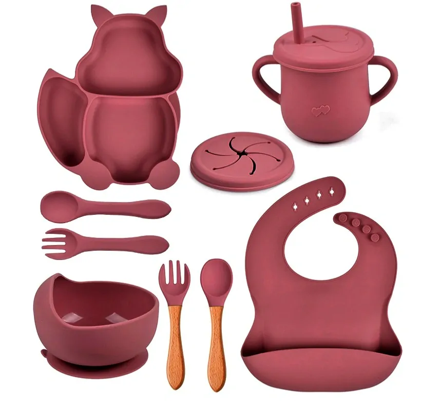 Silikonová jídelní sada 9-dílná pro děti VEVERKA – Dark Pink