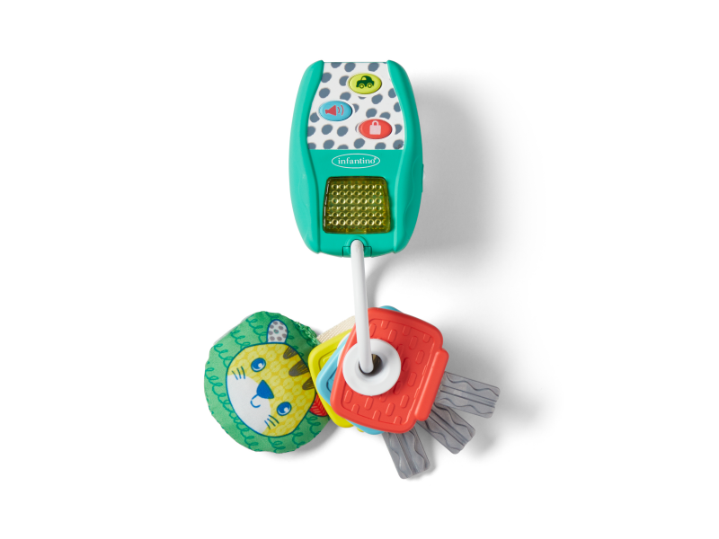 Barevné klíčky z příjemného materiálu s ovladačem, který po zmáčknutí svítí a hraje pět melodií a zvuků.