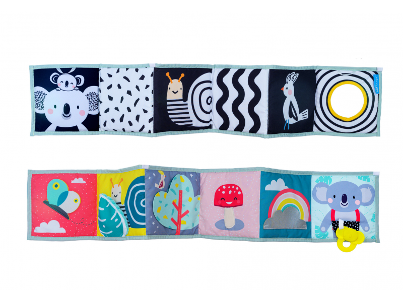 Oboustranná textilní knížka pro nejmenší je určena do kočárku, postýlky i na hrací deku.