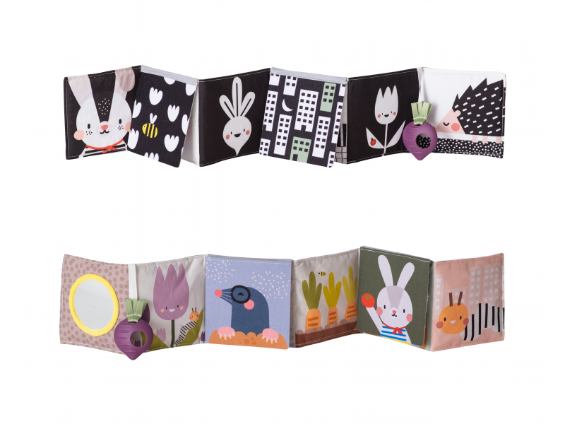 Oboustranná textilní knížka pro nejmenší je určena do kočárku, postýlky i na hrací deku.