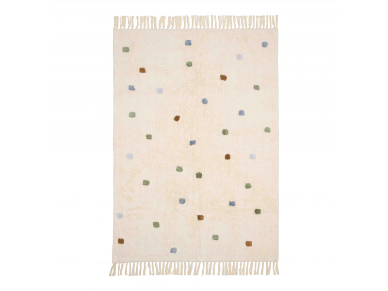 Vneste do dětského pokoje hřejivou a veselou atmosféru s koberečkem od značky Little Dutch! Koberec má béžový podklad zdobený hravými puntíky v modré, zelené a okrově žluté barvě. Třásně na kratších stranách dodávají designu útulný a originální vzhled. Vašemu dítěti se na něm bude krásně sedět a hrát si.