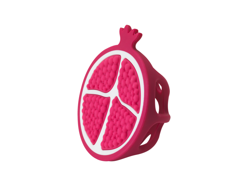 Kousátko v podobě granátového jablka je vyrobené z jemného měkkého silikonu. Různorodé textury lákají dítě ke zkoumání v ústech a pomáhají tak při prořezávání prvních zoubků. Lehounké kousátko má tvar pro snadné uchopení malými dětskými ručičkami.