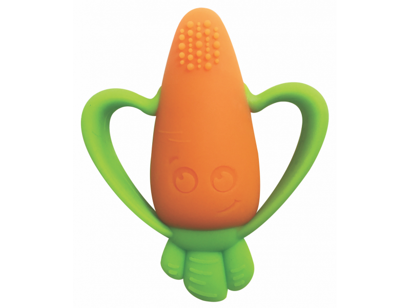 Rozkošné kousátko v podobě usměvavé mrkvičky je vyrobeno z pružného měkkého silikonu. Různorodé textury lákají dítě ke zkoumání v ústech, masírováním dásní kousátko pomáhá dítěti při prořezávání prvních zoubků.