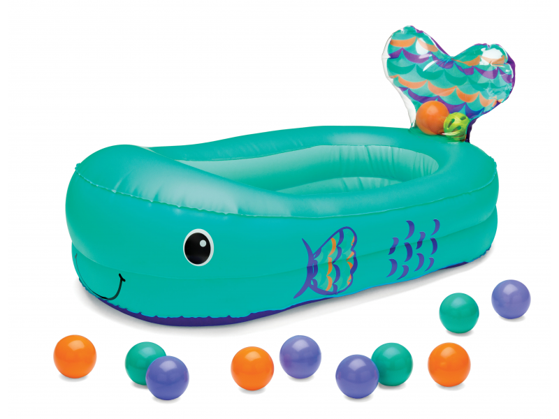 Nafukovací vaničku v podobě velryby využijete doma i na cestách. Teplotní senzor ve vaničce vám pomůže hlídat optimální teplotu pro koupání, která by měla být v rozmezí 32,2°C a 37,8°C. Při tomto optimálním rozmezí teploty vody se senzor zabarví.