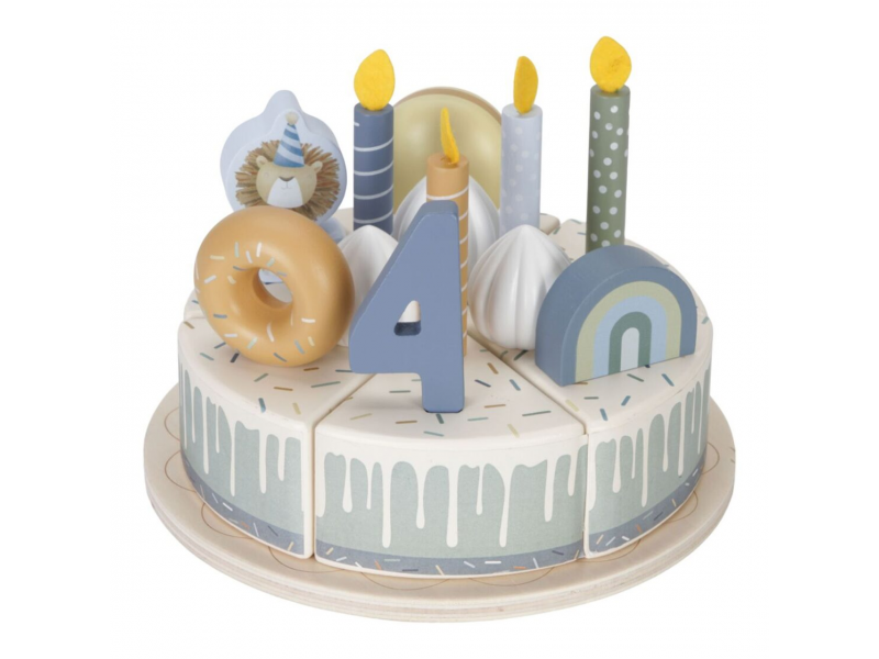 Sada s dortem v krásném dřevěném provedení obsahuje 6 kousků dortu, 8 odnímatelných zdobení, 5 číslic, 5 svíček, talíř na dort a servírovací lopatku.