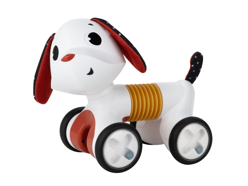 Roztomilá hudební hračka v podobě pejska s natahovacím harmonikovým tělem a kolečky zabaví dítě od hraní na bříšku přes lezení a samostatné sezení až po první krůčky. Stisknutím hlavy se pejsek rozjede, umí i štěkat a hrát 5 melodií. Díky ohebnému tělu umí sedět i při jízdě zatáčet. Jeho hlavou s šusticíma ušima je možné otáčet.