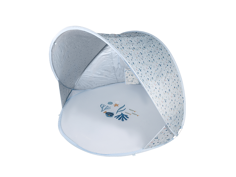 Přenosný skládací stan s UV faktorem 40+ pro ochranu dítěte před sluncem na zahradě, na pláži či na výletech do přírody. Stan umožňuje snadnou ventilaci díky zadnímu okénku na zip. Dvě kapsy na vnitřní stěně nabízí prostor pro uložení drobností.