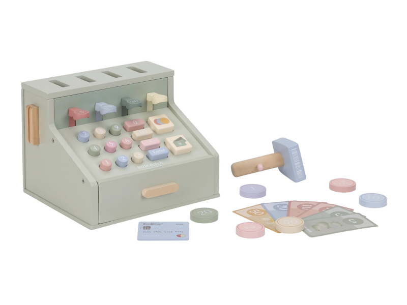 Počítej, skenuj a markuj! S touto krásnou dřevěnou pokladnou bude hra na obchod ještě zábavnější a realističtější. Pokladna je vybavena skenerem, čtečkou karet, tlačítky a zásuvkou na mince a bankovky. Součástí je i platební karta, takže malí prodavači mohou přijímat hotovost i bezkontaktní platby.