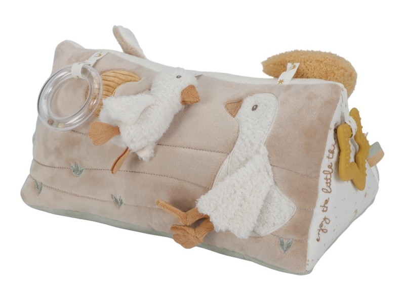 Dotýkej se, hraj si a objevuj! Tento měkký trojhranný polštářek nabízí vašemu miminku spoustu vjemů a zábavy. Různé textury, jemné zvuky a roztomilé detaily podněcují smyslový vývoj a motivují ke zkoumání.