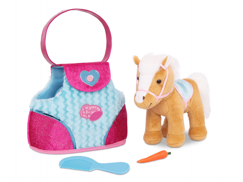 Nádherný plyšový poník v kabelce s krásným potiskem je vždy připravený na mazlení i na procházku. Miluje vyčesávání své hebké hřívy hřebínkem a díky kabelce si jej vaše dítě může vzít kamkoli. Kabelka má postranní otvory, aby poník při přenášení viděl na svět.
