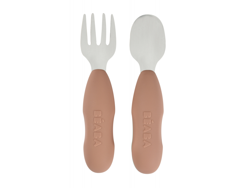 První příbor z kvalitní nerezové oceli s plastovou rukojetí usnadní dítěti přechod od krmení lžičkou k používání příboru. Nerezová vidlička a lžička jsou lehké a díky ergonomickému plastovému držadlu snadno uchopitelné dětskýma rukama. Mělká lžička je ideální pro nabrání malého množství příkrmu, které dítě dokáže donést až do úst. Zakulacené hroty vidličky jsou zárukou bezpečného používání.