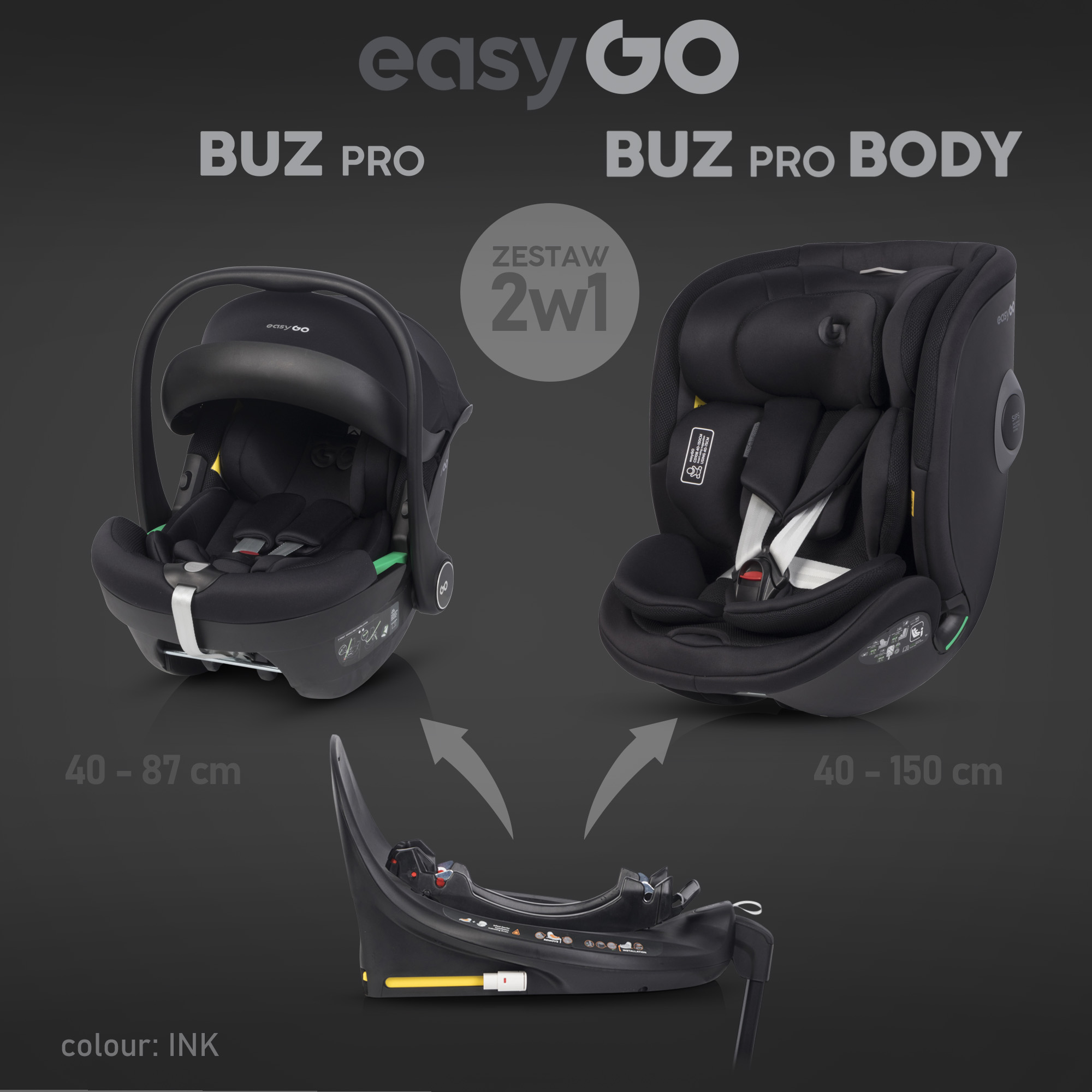 Sada 2 v 1 se skládá ze dvou autosedaček a jedné společné otočné základny ISOFIX. Autosedačka EASYGO BUZ PRO pro děti vysoké od 40 do 87 cm obsahuje otočnou základnu ISOFIX, na kterou lze namontovat i EASYGO BUZ PRO BODY. Tímto způsobem vytváříme sadu 2 v 1, což je cenově výhodnější řešení než pořízení dvou samostatných autosedaček se dvěma samostatnými základnami. Sada autosedaček BUZ PRO a BUZ PRO BODY umožňuje přepravovat děti od narození až do výšky 150 cm, t.j. po celou dobu používání autosedačky.
