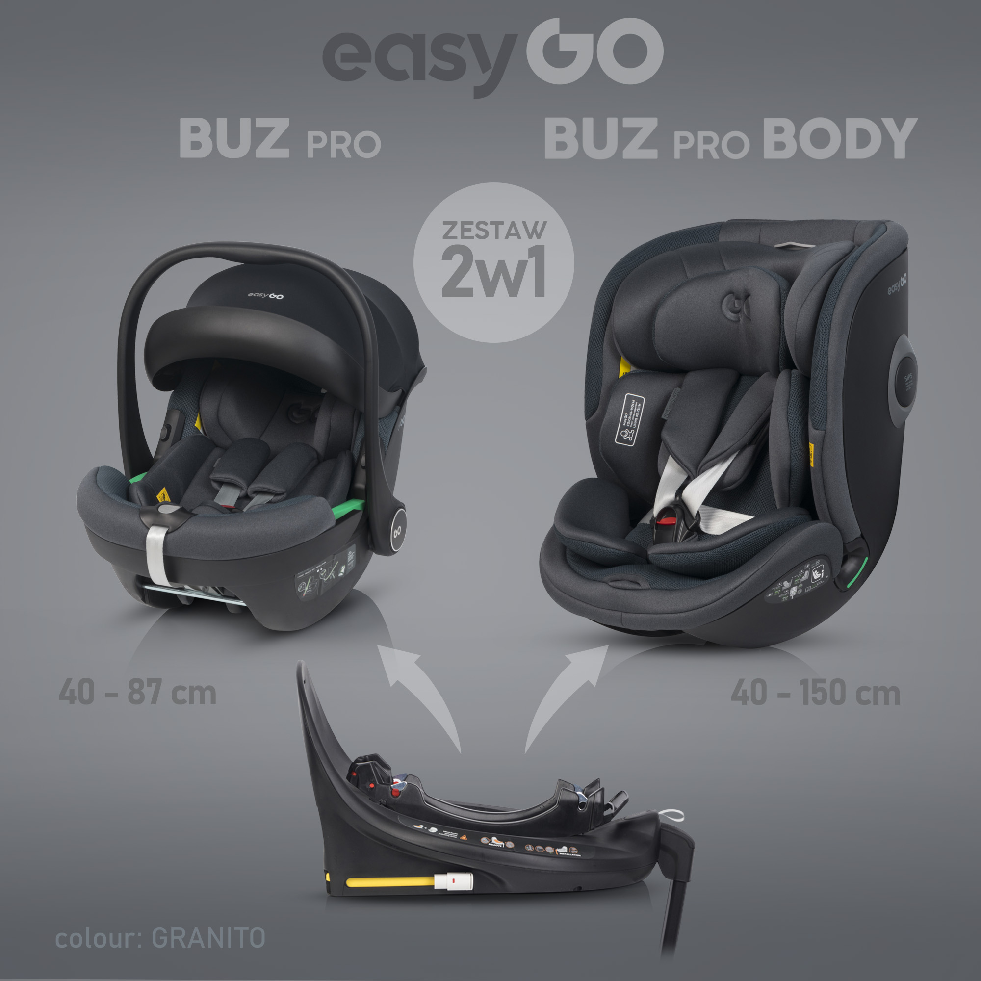 Sada 2 v 1 se skládá ze dvou autosedaček a jedné společné otočné základny ISOFIX. Autosedačka EASYGO BUZ PRO pro děti vysoké od 40 do 87 cm obsahuje otočnou základnu ISOFIX, na kterou lze namontovat i EASYGO BUZ PRO BODY. Tímto způsobem vytváříme sadu 2 v 1, což je cenově výhodnější řešení než pořízení dvou samostatných autosedaček se dvěma samostatnými základnami. Sada autosedaček BUZ PRO a BUZ PRO BODY umožňuje přepravovat děti od narození až do výšky 150 cm, t.j. po celou dobu používání autosedačky.
