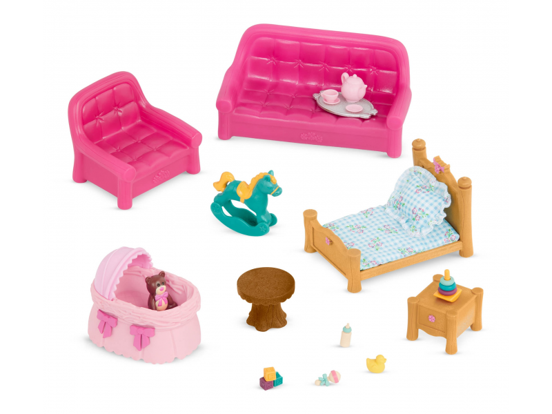Sada nábytku vám umožní vybavit a zútulnit obývací a dětský pokoj v domečku pro postavičky zvířátek Li'l Woodzeez. Uložte miminko po nakrmení z lahvičky do kočárku, aby si rodiče mohli vychutnat kávu na pohodlné pohovce! Domeček i postavičky zvířátek se prodávají samostatně.