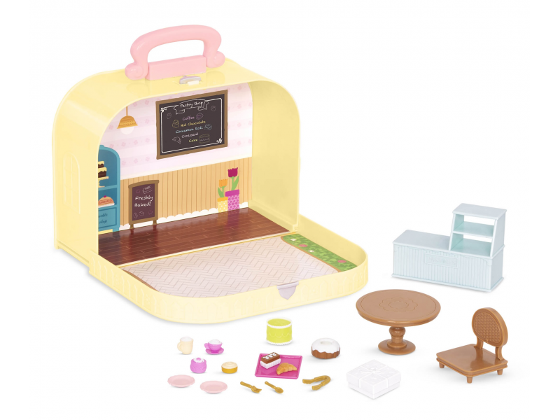 Cestovní sada hraček Li'l Woodzeeze v praktickém kufříku umožní vašemu dítěti hrát si se kdekoli na dovolené, výletech či během víkendu u prarodičů. Kufřík se po otevření promění v bohatě vybavenou cukrárnu s nábytkem a doplňky.