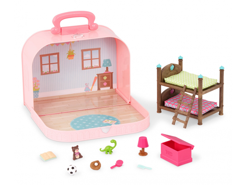 Cestovní sada hraček Li'l Woodzeeze v praktickém kufříku umožní vašemu dítěti hrát si kdekoli na dovolené, výletech či během víkendu u prarodičů. Kufřík se po otevření promění v bohatě vybavený dětský pokoj s nábytkem a doplňky.