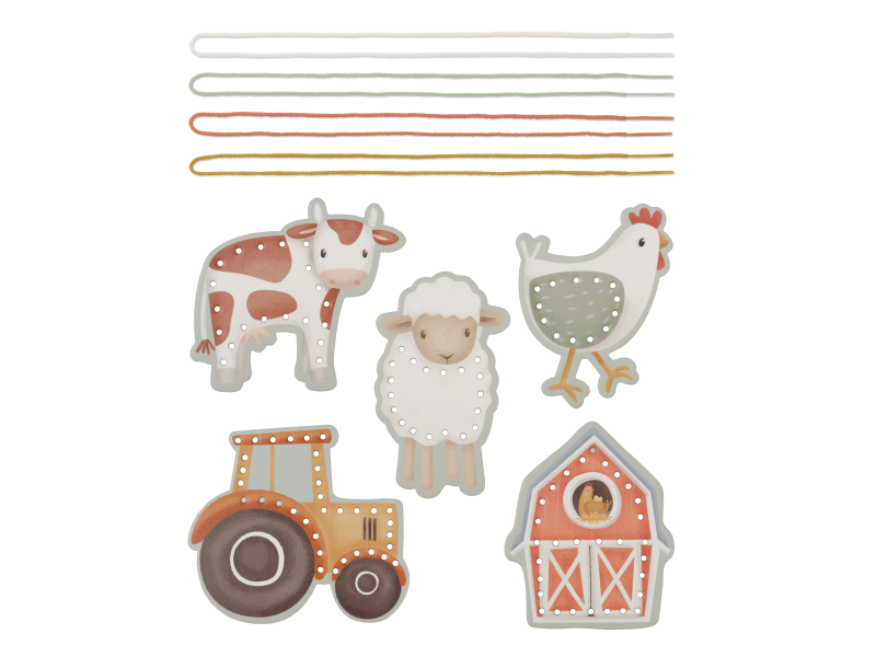 Sada pěti kartonových karet s otvory pro provlékání šňůrek je originální hračkou, která vaše dítě zabaví a zároveň podpoří jeho kreativitu i trpělivost. Karty v podobě kravičky, ovečky, slepičky, traktoru a stáje jsou vyrobené z kvalitního pevného kartonu a množství otvorů nabízí nekonečné množství způsobů provlékání šňůrky. Šňůrka v podobě tkaničky s plastovým zakončením umožňuje snadné navlékání i malým dětským ručičkám.