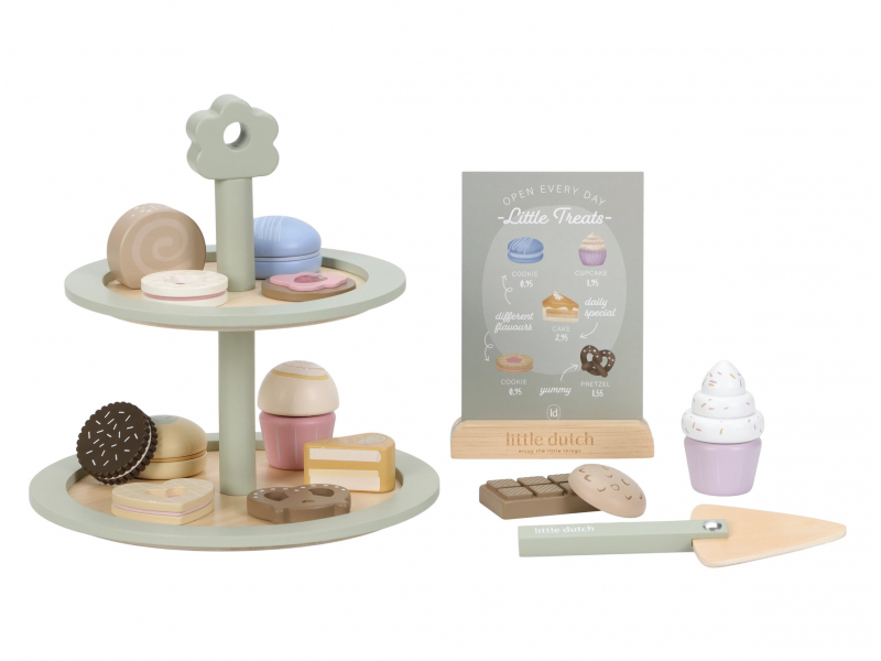 Máte chuť na sladký dezert? Nádherný stojan na cukroví Little Dutch s výběrem sladkých dobrot je jako stvořený pro všechny malé hostitele a hostitelky. Na dvou patrech mohou aranžovat a nabízet svým hostům různé druhy lákavých zákusků. Díky obrázkovému menu si hosté mohou vybírat a objednávat svou oblíbenou sladkost.
