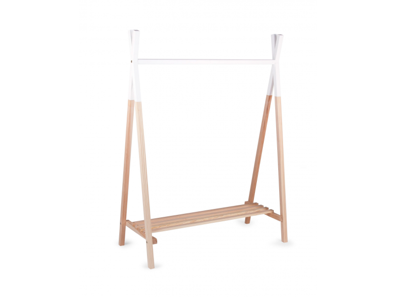 Dřevěný stojan na oblečení Tipi je ideální pro rychlé a pohodlné ukládání oblečení vašeho dítěte. Stojan má ve spodní části polici a nahoře závěsnou tyč.